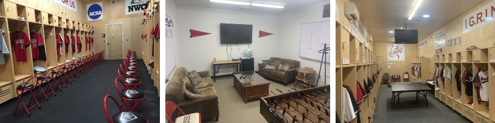 Just behind the 1st base dugout, the Boxers have a beautiful baseball clubhouse. All players have their own lockers and both sides come equipped with TV's, as well as game tables to pass the time during any rain delays or before practice. The clubhouse allows for players to leave their gear in a safe facility right by the field which saves space in their dorms or apartments and eases travel to and from the field.